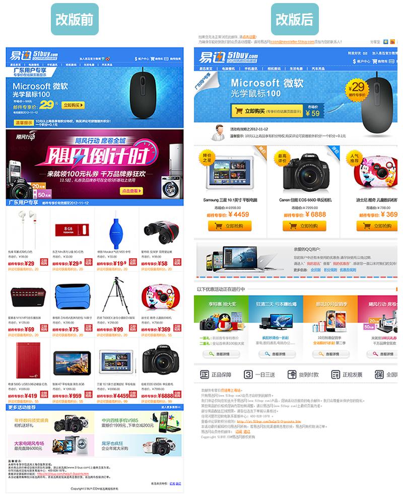 2)易迅网。易迅网是依托著名的IT产品通商上海电子商务发展有限公司而创立的新一代专业电子商务消费服务网站。其以前产品促销类邮件存在模板版头缺少weblink和社会化标签,主推促销区域和促销活动缺乏主次内容划分,商品陈列、“活动展示”区域缺乏设计新元素及视觉冲击力等问题。经过webpower中国区设计团队改版优化后,目前其促销邮件的内容更有层次感,体验度明显上升,率获得大幅度提高。(见下图)