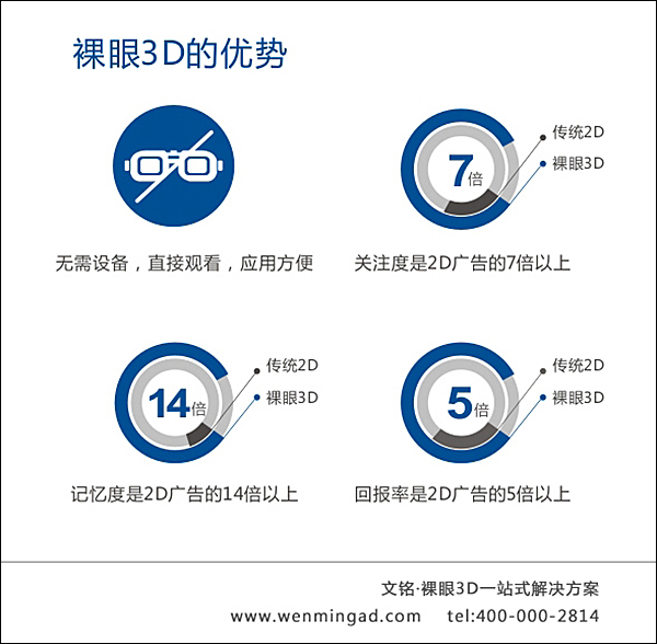 随着裸眼3D在实际应用中所带来的显著效果,作为中国领先的裸眼3D广告整体方案服务商,文铭营销策划机构提供23寸、46寸、84寸以及150寸以上LED拼接裸眼3D广告整体解决方案。同时,文铭把控裸眼3D硬件发展的最新技术并掌握裸眼3D视频内容制作尖端技术,文铭与裸眼3D上下游合作伙伴一起,共同推动裸眼3D的发展,并专业满足客户需求。