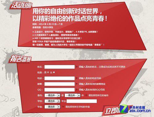 “我的青春派”2014联想YOGA平板青春版设计营销大赛报名页面