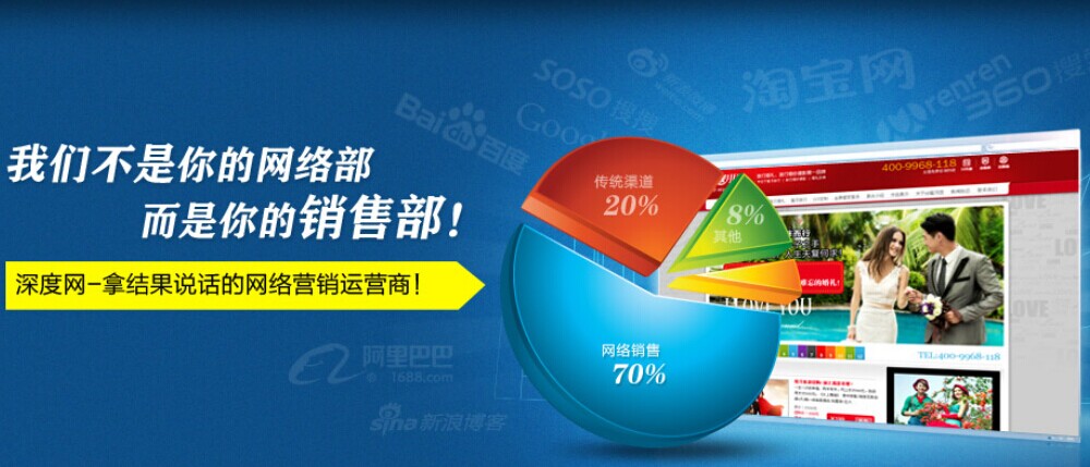 第三:深度网创立于年月,是一家专业的网络营销服务提供商。深度网同时为企业提供:网络营销策划、网络营销顾问和营销型网站建设,一站式网络营销整体实施外包服务。“深度实战网络营销推广服务”—独一无二的企业网络营销整体解决方案,结合于深度自主开发营销型网站系统,使企业网站与网络营销、网站优化、品牌推广同步进行,让潜在客户主动搜索点击您的企业网站,实现不断获取潜在客户之核心目标,迅速提高客户率,达成交易,成为企业实现网络营销最有“利”的武器。