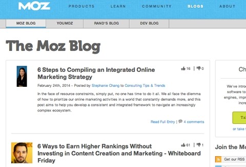 Moz是一个销售营销软件产品的公司,它的博客旨在帮助顾客(潜在顾客)做好集客式营销,因此博客的内容除了介绍产品外,更多专注于一些营销技巧和方法的传授和布道。通过帮助顾客解决实际问题,品牌的得以被人们深刻了解。这种了解大大区别于一般的广告轰炸,它更深入,是顾客从切身体验出的一种认同感。没有人关心产品,人们只关心产品能解决什么问题,产品解决了问题,品牌才有价值。#3:营销目标和博客目标结合博客作为营销工具,自然要为营销目标而服务。各种五花八门的营销手段让人晕头转向,企业高层可能没有意识到博客在市场营销活动中的重要性。如果利用得当,博客除了沉淀品牌文化,也能有立竿见影的效果。比如说:增加社交的粉丝数量,提升潜在客户好感度,助力品牌宣传活动等。博客可以帮助实现以下营销目标:1. 展现你的专业知识和行业领导风范2. 教育、鼓励顾客,传递重要讯息。3. 提高关键词在搜索引擎的可见性和自然排名,增加品牌度4. 和顾客建立长期稳定的关系,挖掘潜在客户和商业同盟。#4:选择你的博客内容话题前面的几个步骤确立博客运营的方向和指导思想,那么具体内容该如何选取呢?根据确立的目标,选取7—10个相关话题,落实到具体的内容时,要紧紧扣住围绕实际情况,帮助顾客解决那些最紧迫的问题,就像一本行业期刊一样,内容专业、有参考价值。向顾客提供真正有价值的真实、可靠的内容,切忌大喇叭式的赞美和枯燥乏味的高谈阔论。特别是那些行业内普遍存在的问题,更值得关注,如果人们能从你的博客中找到一个系列问题的解决方案,那将大大提高你在行业中的威信。