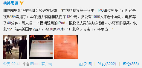 新浪财经驻纽约记者孙思远在新浪微博上说,一位华尔街基金经理称,在纽约搞投资十多年,IPO阵仗见多了,但还是被阿里巴巴震撼了。