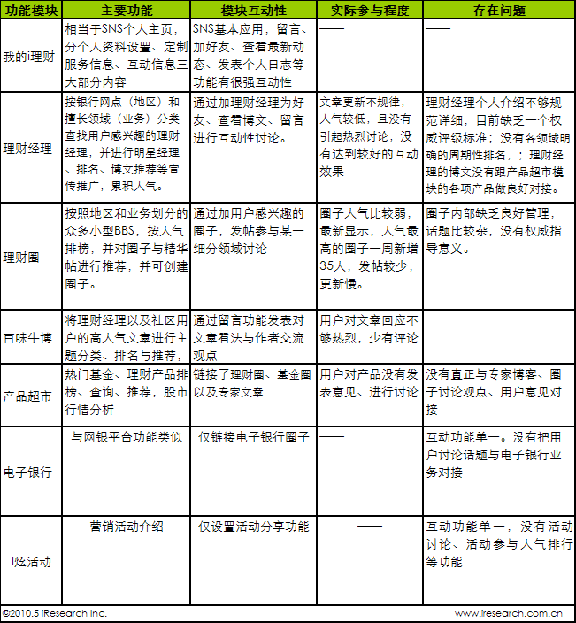 综上所述,理财经理、理财圈、百味牛博是i理财社区主打互能,而产品超市、电子银行以及i炫活动更多是介绍产品以及营销活动,只是简单接入其他模块互能。
