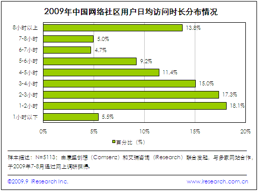 根据艾瑞咨询调研数据显示,13.8%的网络社区用户日均花费在网络社区上的时间超过了8小时,该类人群将一天中1 /3的时间用于浏览使用网络社区,对网络社区表现出极强的依赖性;同时累计近六成的用户日均花费时间在4小时以上。经过一段时间的用户维系,网络社区用户对网站的依赖性逐渐增强,相当一部分用户将网络社区作为其发表感想、分享经验、互动交流的首选方式,从而体现出较高的用户黏性,结合上述用户覆盖上的数据来看,网络社区在流量及黏性两方面,均体现出较为优良的价值。