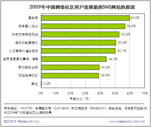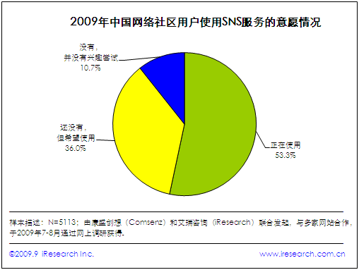 中国网络社区正逐步SNS化,根据艾瑞咨询调研数据显示,2009年中国网络社区用户对SNS服务表现出高度的热情,53.3%的用户正在使用SNS服务,36.0%的用户表示希望使用SNS服务。艾瑞咨询分析认为,中国网络社区用户表现出日益增强的分享和互动意愿,SNS服务通过好友分享、娱乐互动等项目,使用户间的沟通交流更加立体化和形象化,契合了用户需求,因此,SNS元素对于以BBS为主体的传统网络社区来说,是一种有益的补充。