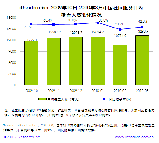 根据艾瑞咨询iUserTracker网民行为监测系统数据显示,2009年10月-2010年3月社区服务的日均覆盖人数呈现稳步增长的趋势,截止2010年3月,社区服务日均覆盖人数达到13298.9万人,相比2008年同期增长42.8%。日均覆盖人数的稳定增长一方面体现了社区服务在用户基数进一步夯实;另一方面,在用户黏性层面反映出用户较高的忠诚度,对社区服务的依赖性逐渐增强。