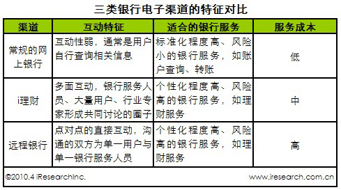 艾瑞观点:对银行来说,其更希望增加收益高的理财产品的销售,但常规的网上银行在降低银行运营成本的同时,对理财产品销售的拉动作用却十分有限。艾瑞咨询认为,也是出于这方面的考虑,招商银行在2010年3月推出“远程银行”服务,回归“水泥+鼠标”时代。但无论是电话银行还是传统的柜台服务,都有其局限性,例如成本高,互动仅局限于一对一的交流等。而“i理财”服务,一方面借鉴了网上银行的低成本,另一方面又引入互动,且这种互动更为广范,包括参与人数的广泛和形式的广泛,如具备用户点评功能等。