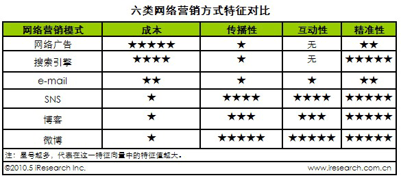 随着四大门户将微博作为标配,微博这种新的形式已在中国迅速积累起大量人气,在此基础上,借助病毒式的能力以及极强的互动性,微博逐渐成为商家营销的必争之地。在此,艾瑞咨询从四个维度对六类网络营销的特征做出对比: