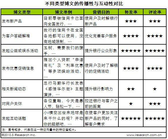由对比数据可以看出,银行直接发布新产品或公布银行相关动态,用户的转发率和评论率都不高。而通过发起互动话题,或回答用户疑难问题的形式,获得的和互动效果却比较好。由此艾瑞,银行在通过微博营销时,需注意以下点:
