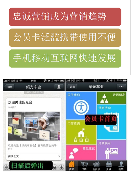 众所周知,会员卡系统经历了第一代单机版会员卡系统、第二代网络版会员卡系统,到现在第三代利用云服务计算架构和融入移动应用技术的全新会员系统,满足了消费者基于手机移动应用的需求。虚拟化的微信会员卡,不但方便携带、管理与使用,更成为会员与商家信息互动的平台。会员只需要用手机即可完成会员消费享受优惠全过程。会员管理系统是商家进行管理会员、积累老客源、招募新会员的利器,同时结合当下最热门的微信应用,一卡易的商户,可实现让顾客扫描商家专属微信二维码,即可成为商家的会员,后续会员只需带手机,即可完成会员消费全过程,给会员带来更多便利。商家还能发布‘微商城’,会员通过‘微信支付’即可完成下单、购买,帮助商家拓展第二条销售渠道。
