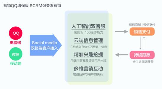 来看一下,营销QQ增强版横跨QQ和微信双平台,在PC端通道,企业可在网站、MINISITE等多个渠道嵌入营销QQ,通过趣味创意营销手段鼓励用户主动与品牌进行交互;而在移动端通道,可以通过移动终端扫描二维码的形式,将用户为微信号粉丝,从而进行进一步互动和营销。如此,通过QQ和微信的互补整合,覆盖PC和移动双终端,将不稳定的”弱关系“为企业可控的“强关系”商机,更好地运用SCRM营销。