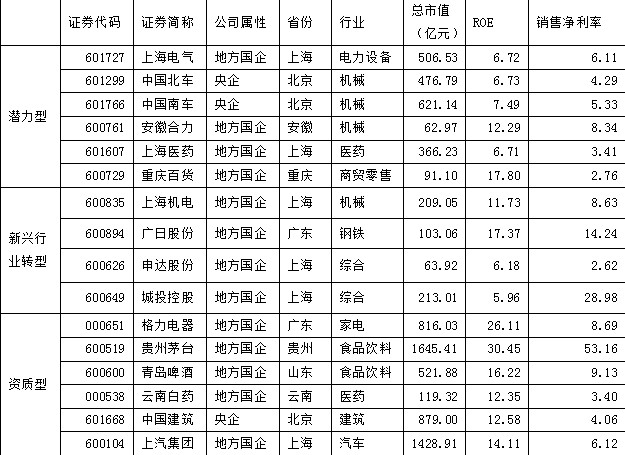 首先,通过当前国企的竞争力水平:潜力型、向新兴行业转型以及资质型,我们总结出来潜力较好的国企通常是各项财务指标在行业里都不错,但是盈利模式和公司的管理结构有改善的空间,并且正是由于其盈利模式和管理结构的,业绩和估值都受到了一定的,所以国企或成为其催化剂,促进公司业绩和估值更上一层楼。其次,向新兴行业转型的国企,预计会在融资、项目审批、税收等方面给予一定政策优惠,这也会加速企业从传统行业向新兴行业的战略转型,对致力于加快转型的企业有望受益。当然,对于财务指标位于行业前列,公司自身资质较好的企业,民营化的加入会让公司更加市场化,效率由此得到进一步提升。结合广发证券(000776,股吧)以及长城证券的推荐,我们研究小组重点关注机械设备、医药、食品饮料、汽车、电子等行业(如表二)。