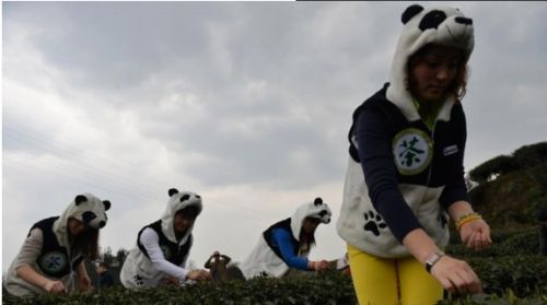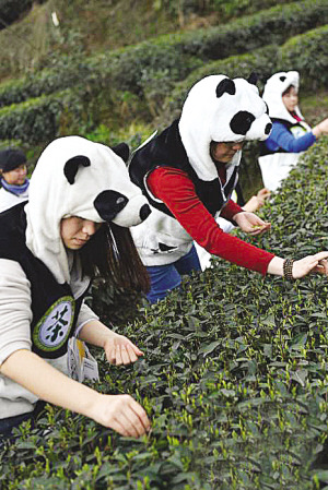 3月12日,几名打扮成大熊猫模样的采茶女首采2014年“熊猫茶”开园春茶。每年“熊猫茶”开园春茶中“极品”售价一斤最高达22万元人民币。这些茶树由于在种植过程中熊猫粪便,因此取名“熊猫茶”。