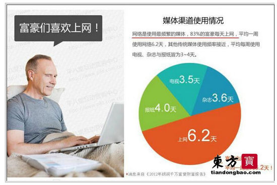 但是很不幸,以专门研究中国有钱人的胡润说了,“有钱人”都上网。连时代都跟不上的有钱人,并不算真正的有钱人。譬如,张三是个猪的,因为猪肉在方圆几里卖得好,赚了几百万,他算是“有钱人”吗?东方宝认为他不算,他最多算个没文化的“暴发户”,因为他跟不上时代,早晚会打回原形变成一个“一般人”。同样是卖猪肉的李四,通过互联网和实体销售猪肉,销售网络覆盖到全国,赚了几千万,他算是有钱人吗?东方宝认为他算,懂得利用最先进的武器武装自己,跟上了时代,他的财富必然会与日俱增,无论现在,还是未来,始终可以确保有钱人的地位。