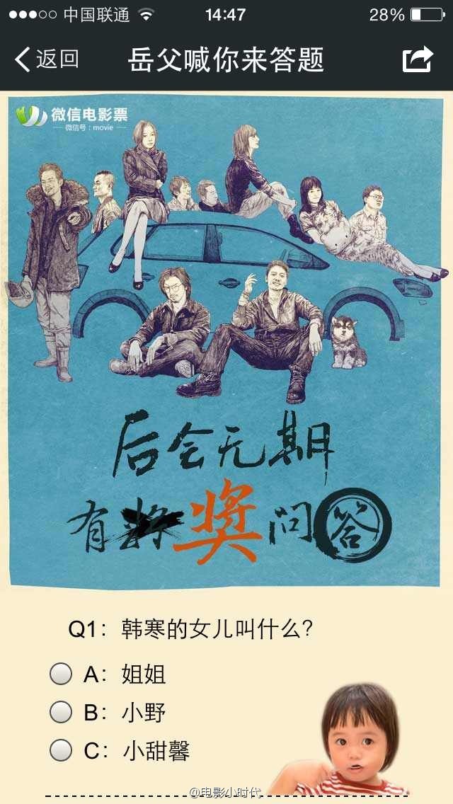 今天《小时代3》微博发飙@《后会无期》以及《后会无期》的片方博纳影业,其以郭敬明的身高来宣传《后会无期》,在一个“岳父喊你来答题”的环节中,出现了这样的问题:韩寒比小明高多少:A:1.3米 B:0.3米 C:0.03米 问题旁边还附上郭敬明和韩寒站在一起形成身高差的漫画像。
