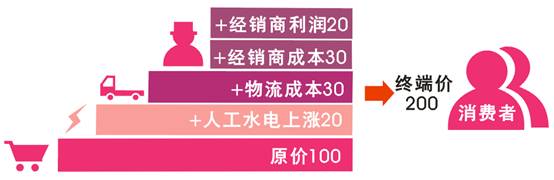 除了营销的低效率,整个行业还存在着巨大的成本浪费问题。近期,亚太传媒新出炉的调研报告反映了很多家具品牌工厂的现状。由于行业大部分中高档产品产自沿海,企业从内地购买原材料运至沿海生产,再将产品运回内地销售,两次运输和四次装卸使物流成本高达30%。报告指出,层层分销及人工等成本上涨,导致使得产品价格增加100%。