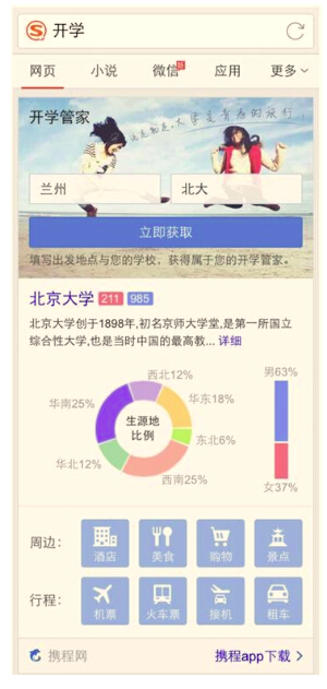 正基于此种考虑,国内领先的综合性旅行服务公司携程网携手,依托日渐成熟的星云大数据分析系统,利用跨屏多平台优势,以新生出行旅游票务服务等实际需求出发,为即将踏上旅途的校园新生提供点对点的校园及城市间的“住、行、玩”信息,尝试全新的基于大数据技术的跨屏整合营销。