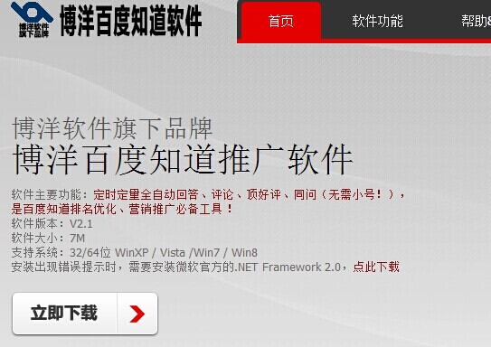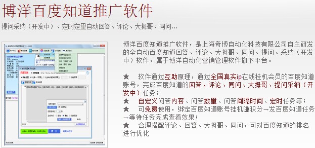 做百度推广,首先要有准备工作,准备工作的前提必须要有百度的账号,百度账号的质量是必须要重视的。前面已经提到百度账号比较难养。在提问或回答问题的时候要注意的事项有很多,一不小心就会被封号。因此在回答问题的时候,我们要针对问题进行回答,要尽量回答的真实,从提问者或是问题的本身来进行回答。即使你是从别的地方看到有人提问过类似的问题,把别人的内容直接复制过来,那么也要融入自己的语言,不能就原版本直接不加一点修改的回答上去,这样的回答通过率比较低。介绍这么多大家一定觉得百度问答营销推广太过于复杂,不禁会问难道就没有捷径吗?其实做任何事情都是有捷径的,百度问答营销推广也不例外。在这里为大家介绍一款博洋百度知道软件http://。博洋软件是一款可以定量自动回答问题,回答内容均是人工真实回答,所以完全不用担心回答问题内容的重复不真实性。