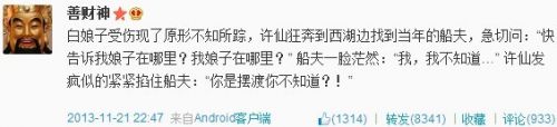 看个去年比较火的段子。白娘子受现了原形不知所踪,许仙狂奔到西湖边找到当年的船夫,急切问:“快告诉我娘子在哪里?我娘子在哪里?” 船夫一脸茫然:“我,我不知道” 许仙发疯似的紧紧掐住船夫:“你是摆渡你不知道?!”(@善财神)