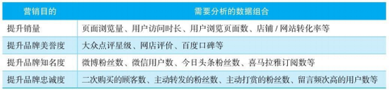 不同的营销目的需要挖掘与分析的数据不同,因此需要根据不同的营销目的进行不同的营销数据组合设计,便于后续的数据分析与总结,如表1-2所示。