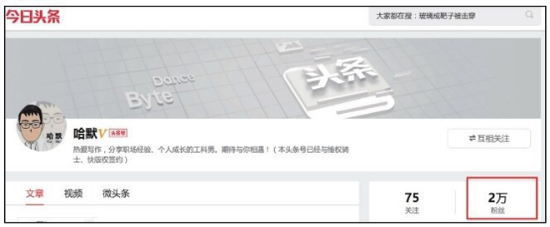 在网上,企业品牌的知名度与“名气”相关,知道企业的网民越多、关注企业号的人越多、阅读企业文章的人越多,则企业知名度越高。因此,在借助数据分析评估企业知名度提升效果时,需要进行挖掘与分析的数据包括微博粉丝数、微信用户数、今日头条粉丝数(见图1-17)、喜马拉雅订阅数等。