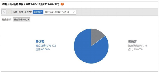 为了评估用户对品牌的忠诚度,可以统计并分析的数据包括二次购买的顾客数、主动转发的粉丝数、老客户访问比例(见图1-18)、主动打赏的粉丝数、留言频次高的用户数等。