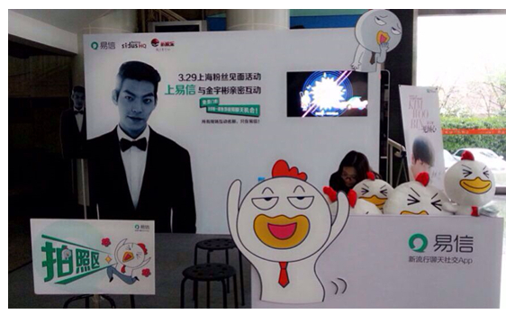 3月29日,由易信独家冠名的“易信·金宇彬粉丝见面会”在上海云峰剧院举行,因韩剧《继承者们》中的“崔英道”一角而走红的韩星金宇彬与在场1500名粉丝进行亲密互动。此次见面会粉丝的所有免费门票都只在易信获得,此外,易信用户还拥有视频聊天、现场互动并获得金宇彬签名宝贝等福利。分析人士指出,这是易信在娱乐营销上又一个大招,平台与明星实现了双赢。