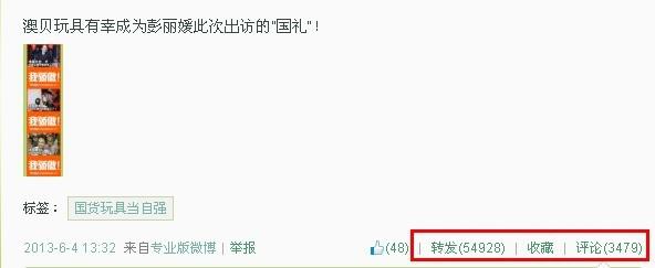 除了形象定位外,对话题的把握也极为关键。很多话题的产生都是瞬间稍纵即逝,这就需要运营人员和妈妈一样细致的敏锐洞察,才能为品牌带来裂变式的效果。去年6月互动派母婴运营组就借势“第一夫人访问南美给当地的儿童捐助了一批玩具,这其中就有澳贝玩具。”的热点新闻,在微博、微信中巧妙植入品牌信息,结果引起了大量网友的围观和转发,从而奠定了澳贝玩具“国礼”的地位。