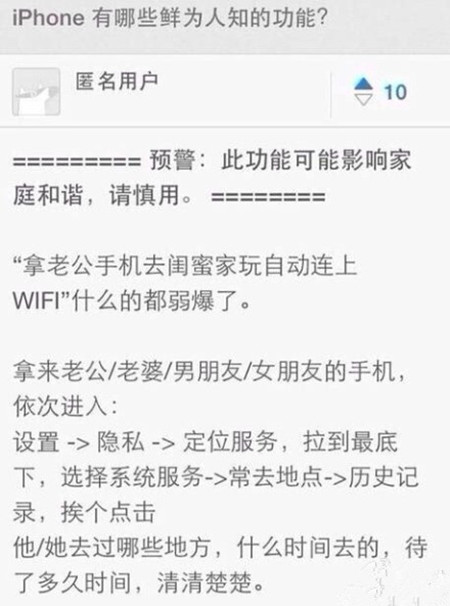 iPhone用户去这里看看吧:设置-隐私-定位服务-最下面的系统服务-最下面的常去地点-随便点开一条历史记录。该查岗的赶紧查岗、该删记录的赶紧删记录、该关闭功能的赶紧关闭,如果影响了家庭和谐别来找我,因为我只是红领巾。