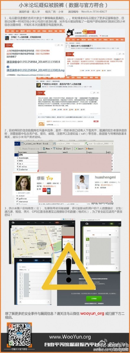 平台,小米论坛数据库泄露,涉及800万小米论坛注册用户。泄露的数据可进入小米账户,通过小米云服务可得到手机号及设备信息;通过同步可获得通讯录,短信,照片,并可在线定位,锁定手机及擦除信息等。小米公关何在?快出来宣布:泄露信息的为山寨论坛。