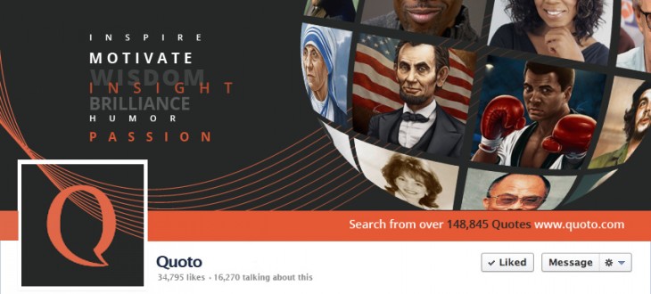 举一个不错的案例吧,它就是Quotery公司,Quotery的主色调常强烈的橙色,设计师Cherie Smith把这个色调运用在了Quotery的Facebook封面照片上。Quotery在他们的logo里面巧妙的利用了橙色,而且在他们的Twiiter上的主题颜色也是橙色。实际上Facebook和Twitter的封面照片保持一致还常简单的,当然也不是说背景图片要完全一致,但是它的确能使品牌营销有更强的一致性。