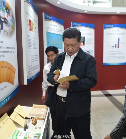 【习:古代经典应成为民族文化“基因”】北师大教师参加了全国课标的制作,习从展台上拿起一本课标书翻看。听说语文、历史、思想三门课标是全国统一,他说,我很不赞成把古代经典诗词和散文从课本中去掉,“去中国化”是很悲哀的。应该把这些经典嵌在学生脑子里,成为中华民族文化的基因。