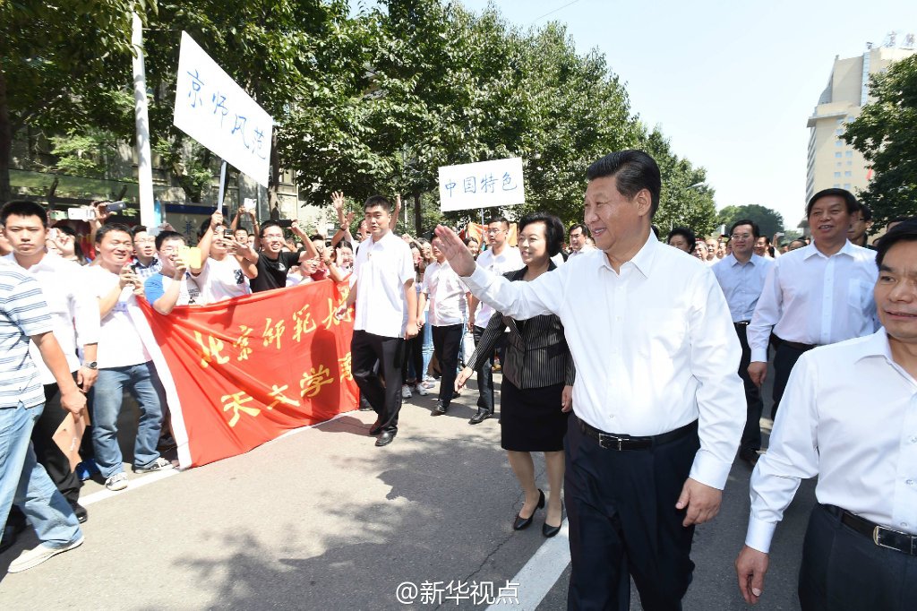 【习考察师范大学】习总9日上午来到师范大学看望一线教师,向全国广大教育工作者致以节日祝贺。在学校主楼参观“重教、筑梦未来庆祝第30个教师节主题展”时,他在“教师世家”、“特岗计划”、优秀教师代表先进事迹等图片图表前驻足停留,听取介绍,不时插话询问。