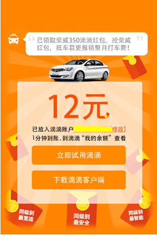 记者了解到,本次滴滴打车红包活动和以往略有不同,活动期间所有用户还可通过点击滴滴打车个人中心的banner或等待接驾页面banner进入荣威350游戏活动页面,在输入手机号手机号后可参与数钱游戏,游戏赢取金额可用作购买荣威350的购车款。“分享+游戏”让滴滴打车“荣威品牌红包”活动更具有病毒性。来自滴滴打车数据显示,仅9月18日活动第一天就有数百万人参与了红包分享活动。