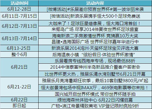 一、微博活动:【#乐居邀你预言世界杯#第一波华丽来袭】有自信你就来预言!即日起至6月28日期间,关注@海南新浪乐居 ,转发活动微博并@ 你的三位好友,说出16进8的8个国家名称,并私信乐居姐你的真实姓名+电话,即可参与活动。猜对5-7个国家获小浪人一个(限前5名);全对获得乐居马克杯一个。