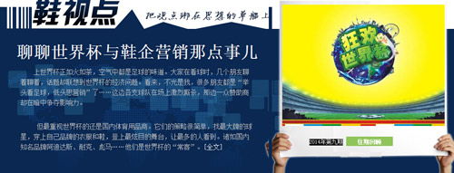慧聪鞋网讯,近几年来,利用体育比赛达至营销的目的,越来越受到国内运动的重视。不要说传统的羽毛球、乒乓球、足球、篮球、网球等体育比赛,就算在被视为“高大上”的高尔夫、马术、帆船等比赛场上,都不时能见到运动品牌的身影。可以说在体育竞技场上运动品牌企业已经是无孔不入。不论是传统的体育项目,还是富人才消费得起的运动,虽然受关注程度高低不一,但讲到影响力,相信都不如全球的第一运动项目——足球。而在足球比赛之中最受关注的,毫无疑问就是四年一届的世界杯。2014足球世界杯正在巴西如火如荼地进行着,随着赛程进入到第二阶段的淘汰赛,一场定的比赛节奏,也再次将巴西世界杯推向了另一个。界期间,国内鞋服企业到底该如何玩转体育营销呢?