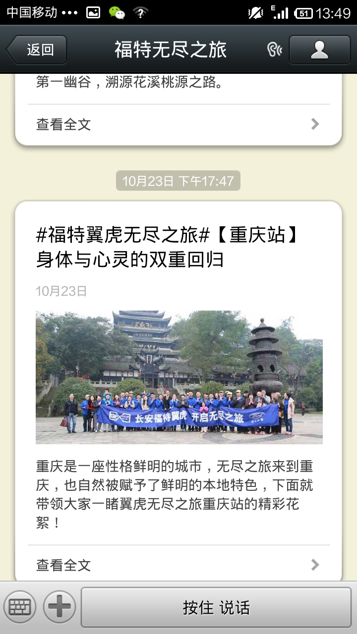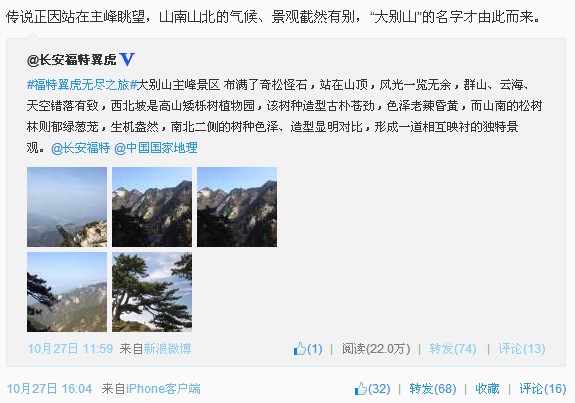 将私房路线与大众的试乘试驾进行升华,将微博和微信线上展示与线下分享紧密相结合,将体验和感受共分享。这是翼虎无尽之旅的三个最大的特点。特别是中国国家地理等的介入,让长安福特翼虎的微博和微信直播和互动传播度大增,不仅和现场的车友互动同时和线上的车主和潜在车主互动,让跟多的人通过微博微信上难得一见的美景,搭载翼虎的用车信息,让广大受众更容易接受和感受到翼虎的魅力!