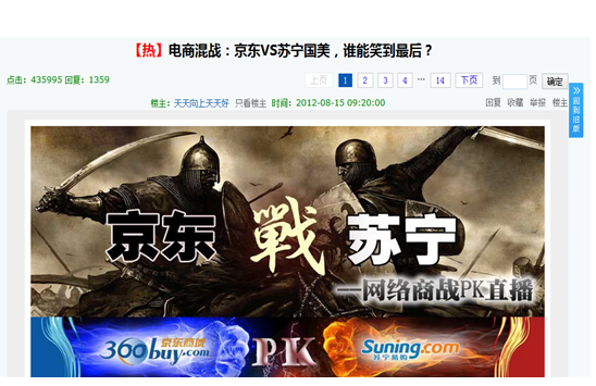 同时,天涯社区开设了“815电商专题”,以专题形式承载有关价格战的各类声音,并通过意见领袖,进行深度探讨和正面引导,使讨论获得理性回归。为此,天涯社区组织了财经观察员、IT数码行业资深人士以及天涯资深评论网友,对京苏大战发表更具深度的见解,将京苏大战推向新的高度,成功塑造苏宁易购价格与服务优势。