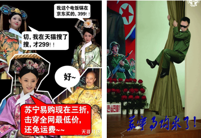 去年8月,爆发了一场发端于新浪微博,并逐渐蔓延到社区、门户网乃至整个互联网,应战方从最初的京东、苏宁易购、国美扩展到各大知名电商的“价格大战”。为配合苏宁易购在舆论上打响打赢这场价格战,天涯社区成功借助海尔和京东决裂的传闻,推出“决裂体”话题帖,通过网友娱乐化调侃,扩散“价格战“事件的影响力。在“决裂体”话题贴内网友创造了大量PS图片,将苏宁、京东、海尔拟人化,幽默有趣,并与陈奕迅争议性新歌、偶像剧《轩辕剑》、伦敦奥运等热点内容结合,增加了话题的娱乐性和趣味性,吸引了更多网友的参与和讨论。
