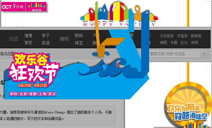 以“一票通玩嗨翻天”的传播口号,串联起欢乐谷多个场景进行分镜展示,互联网端广告创意通过特型视频、联动广告、视频前贴片等形式进行多样化视觉冲击,移动互联网端也通过手机banner广告、HTML5形式的minisite的炫目视觉表现吸引用户关注与点击。两屏间的创意表现贯彻一致,有效实现了创意吸引的目标。