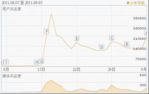 在8月16日进行的小米手机发布会上,小米手机的神秘面纱被全部解开,超强的配置,极低的价格,极高的性价比,小米手机凭借这些特点赚足了的眼球,而雷军也以乔布斯的风格召开的“向乔布斯致敬”的发布会而被所。根据下图我们可以发现,就在这次的新闻发布会之后,小米手机在网络上的关注从几千上升到了20多万。