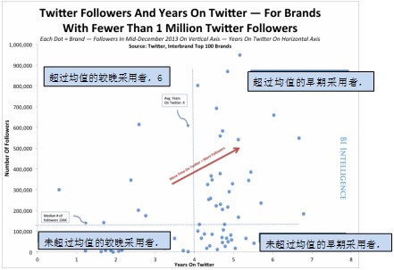 在社交中,存在积极的“早期采用者效应”。对于大多数品牌来说,早投入,就意味着相对于后来者有更多的粉丝。简单的统计数字、散点图和趋势线,都显示在热门社交网中,活跃时间与粉丝规模有明确的相关。