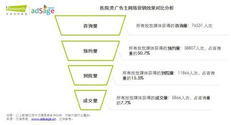 医院类广告主网络营销投放整体带来的成交量占咨询量7.7%根据艾德思奇合作伙伴提供的数据,艾德思奇管理的某个医疗类广告主,所投放的整体带来的咨询量为76531人次,最终的成交量为5866人次,占咨询量的7.7%。艾瑞咨询认为,网络营销仅能为医院类广告主带来展示及点击,而如何提高咨询量、预约量、到院量、成交量这一系列数据,则与医院自身的服务及技术水平、服务价格等因素密切相关。