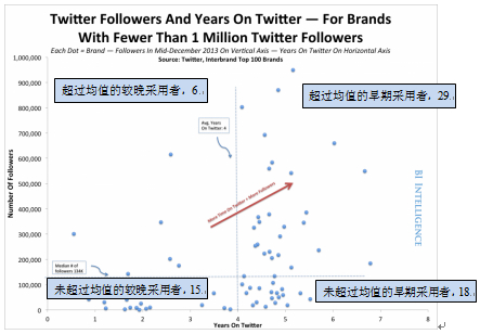 在社交中,存在积极的“早期采用者效应”。对于大多数品牌来说,早投入,就意味着相对于后来者有更多的粉丝。简单的统计数字、散点图和趋势线,都显示在热门社交网中,活跃时间与粉丝规模有明确的相关。
