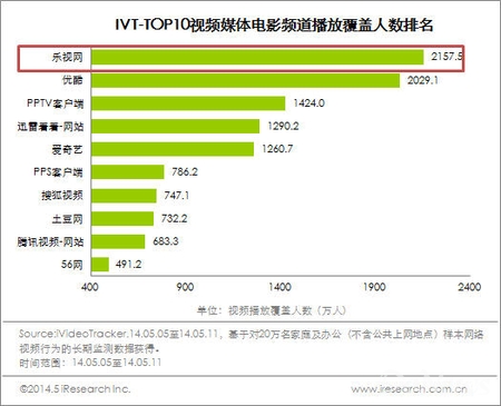 艾瑞最新数据显示,2014年5月 5-11日当周,乐视网电影频道凭借超2100万的视频播放覆盖人数,排名全部视频首位。