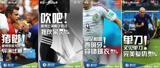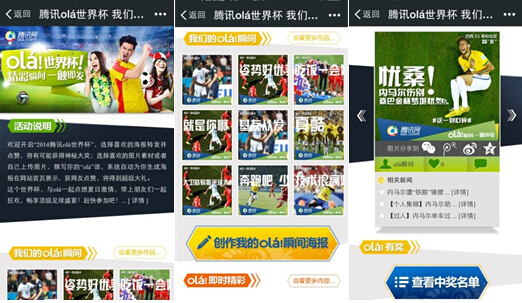 用户互动,真正的在于深度参与。界杯营销开始后的第15天,当制造的实时海报和衍生内容已经形成反响,积累了大量的用户关注后,“2014腾讯olá世界杯”线上H5页面正式从发布平台转为互动平台,这个平台可以允许用户自主以实时海报的格式来创作自己的世界杯海报。