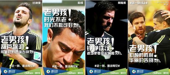 第三周,系列化、情感带入化。随 着比赛的不断深入,老牌强队的爆冷回家、赛场上的大龄球员可能在此届杯赛中完成自己的职业生涯、新生代球星的崭露头角等话题被团队及时捕捉到。而这些看似专业的话题成一种普适化的情感共鸣才能拨动所有用户的心弦。“再见”系列海报和“老男孩”系列海报,纪念这些用户心中神圣的老牌强队和在绿茵场叱咤风 云却即将离开的老球星,也和腾讯所有的用户一起祭奠自己的青春。
