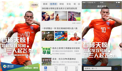 世界杯营销项目深度运用了腾讯网、腾讯新闻客户端、腾讯视频、微视、腾讯微博等平台资源,其中腾讯网、腾讯新闻客户端这两个重点产品的贡献尤其重要。项目进行到第三周,“2014腾讯olá世界杯”线上活动的互动效果已经成为阶段重点。7月6日使用腾讯新闻客户端内广资源取得成效,单日用户访问量创世界杯开 赛以来的最高,占H5页面上线15天以来总访问量的16.4%,用户跳出率更低至23%。并吸引了用户在H5自主生成内容,全平台PV达到70万。仅实时 营销海报在新闻客户端闪屏投放的就达到1亿。