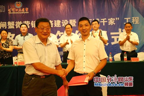 ? ?山东黄河口大闸蟹有限公司总经理高吉存、上海微企动管理咨询公司总经理陈卿林现场签约。