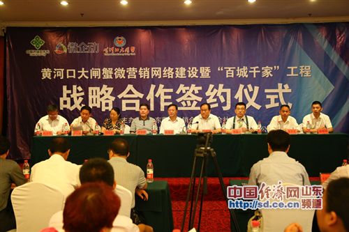 2014年7月21上午,黄河口大闸蟹微营销网络建设暨“百城千家”工程战略合作签约仪式在东城蓝海大酒店。东营市财政局、垦利县海洋与渔业局、垦利县商务局、各县区供销社的负责同志,合作商、代理商代表,等共计120余人出席了签约仪式。